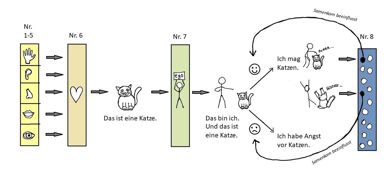 Basierend auf der Bewertung des Objekts werden wir dann eine Handlung ausführen: Wenn ich Katzen mag, werde ich das Tier zum Beispiel streicheln. Dabei mache ich eine Erfahrung, zum Beispiel, dass die Katze sich streicheln lässt – oder, wenn ich Pech habe, sie mich beißt. Diese Erfahrung generiert ein "Samenkorn“, das schließlich im achten Bewusstsein, der tiefsten Ebene, gepeichert wird. Dort liegen Samenkörner für alles, was wir je erlebt haben – nicht nur in diesem Leben, sondern, wenn man an die Wiedergeburt glaubt, auch in allen Leben davor.