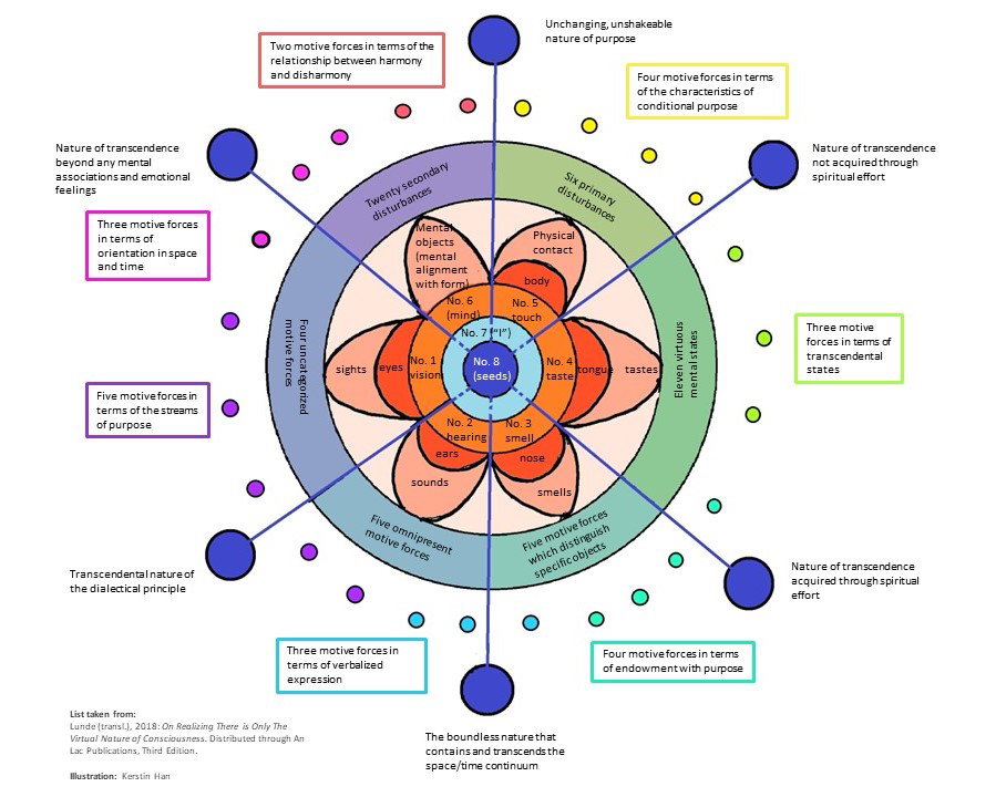 Vereinfacht gesagt bedeutet das, dass zum Beispiel eine "Kaffeetasse" erst dadurch "existiert", dass ihre physische Form von uns wahrgenommen, benannt und bewertet wird. Das ist der Grund, warum die CWSL lehrt, dass alles "Consciousness-Only" (engl.: Alles nur Bewusstsein) ist: Denn ohne die Verarbeitung durch die acht Bewusstseinsarten könnten wir weder die Kaffeetasse, noch den Kaffee darin "erleben". Die CWSL kommt zu dem Schluss, dass es keine dhammas (Phänomene) gibt, die wirklich außerhalb und unabhängig vom Bewusstsein existieren. Alle kognitiven Prozesse basieren also auf dem Zusammenspiel der acht Bewusstseinsarten, allerdings gibt es zahlreiche Faktoren, die mit hineinspielen, indem sie mal dieses, mal jenes Bewusstsein fördern, oder hemmen. Die CWSL listet insgesamt 100 Faktoren auf, die zusammenwirken und so unser "Erleben" der Welt gestalten. Es ist ein hochkomplexes Modell, das wir hier nicht im Detail ausführen wollen; wenn du jedoch neugierig bist, hier ein kleiner Überblick (Grafik in englischer Sprache):